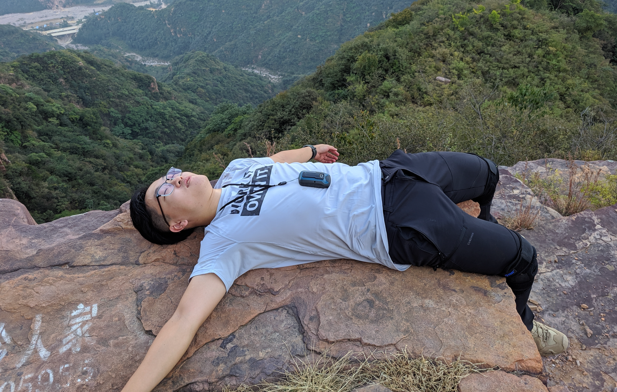 一直爬到下午4点多,到山腰一处平台,卸下背包,休息。往山下望去,还能看到我们出发的那条公路,爬了这么远,有点佩服自己。