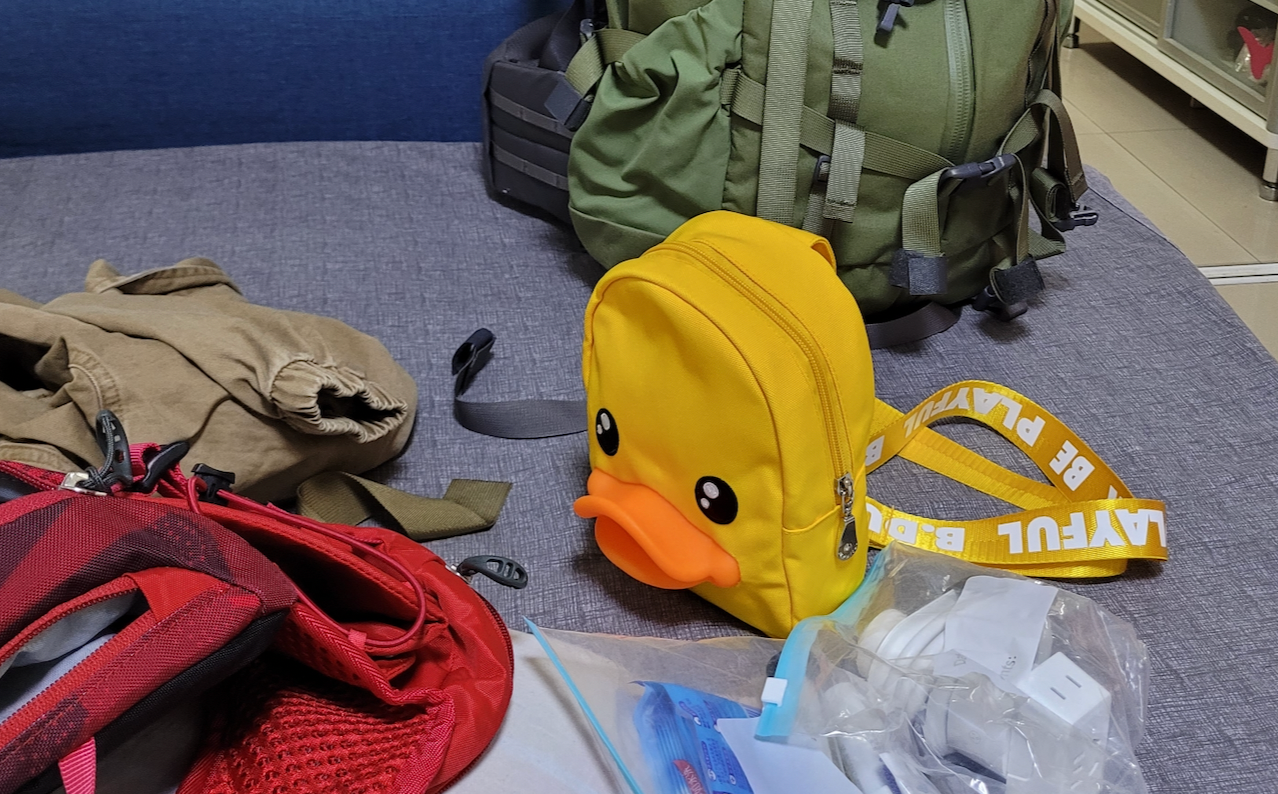 可以看到这次出行我带的装备:神秘农场登山包、小黄鸭胸包、子凌遗留的手提袋,箱子是同事的。