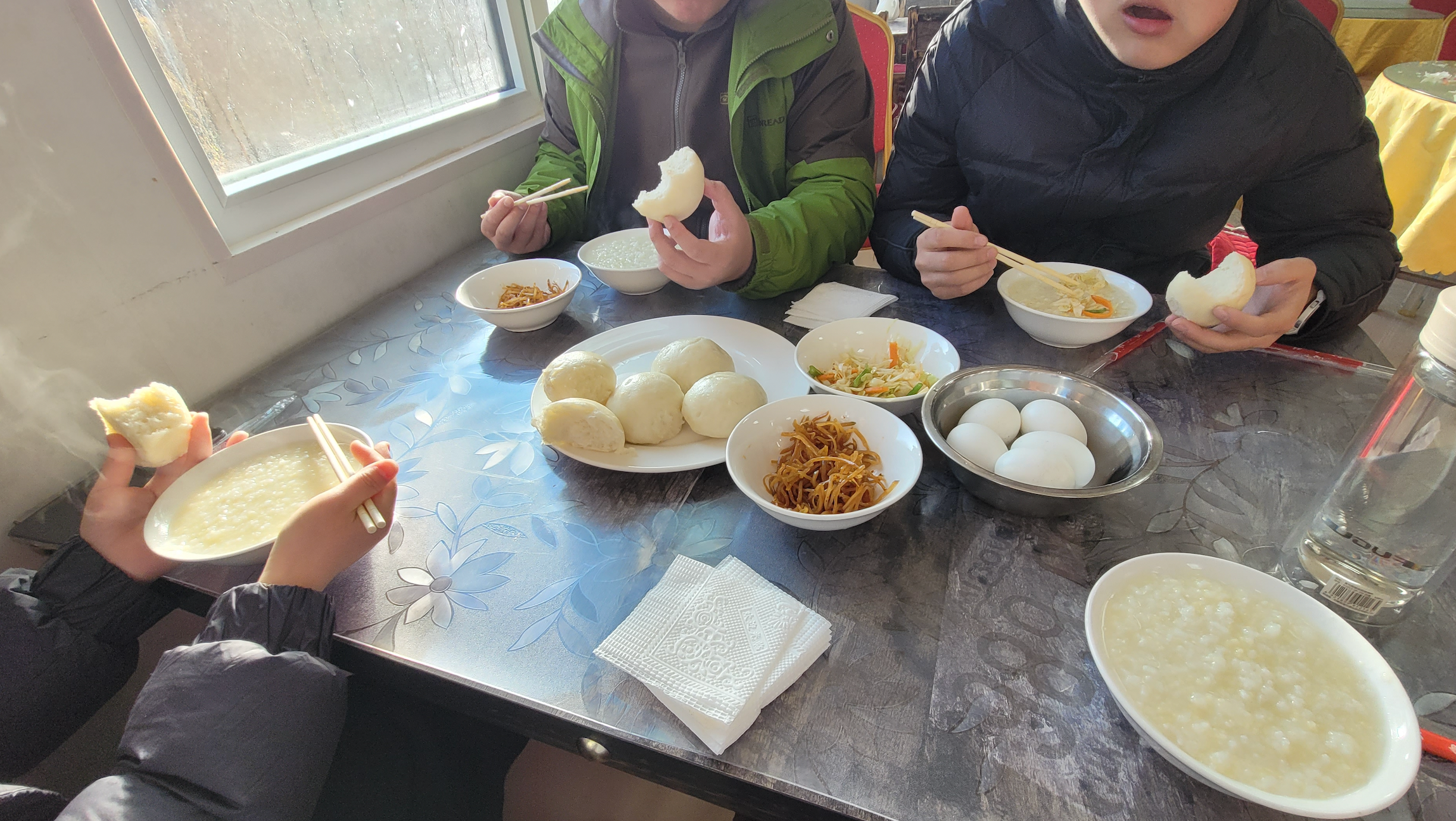 原计划是直接往阿尔山森林公园去的,但大家刚被风吹傻了,又冷又饿,所以我们又回到了鹿村农家乐,房间门还能打开。让老板随便上了点馒头稀饭,吃了顿早餐。