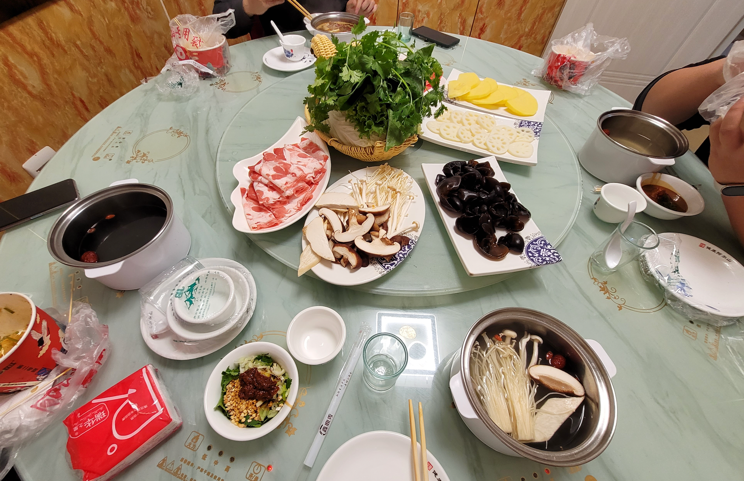 今天的晚餐是在宾馆对面的小火锅。这几天大鱼大肉吃得多了,所以我没点几盘肉。今晚似乎就我们这一波顾客来这家店,店家一直在门口候着。吃完后我感到有些撑,又去了洗手间。在厕所听到店家问我们味道怎么样,胖子直接回答了一句“还行”。