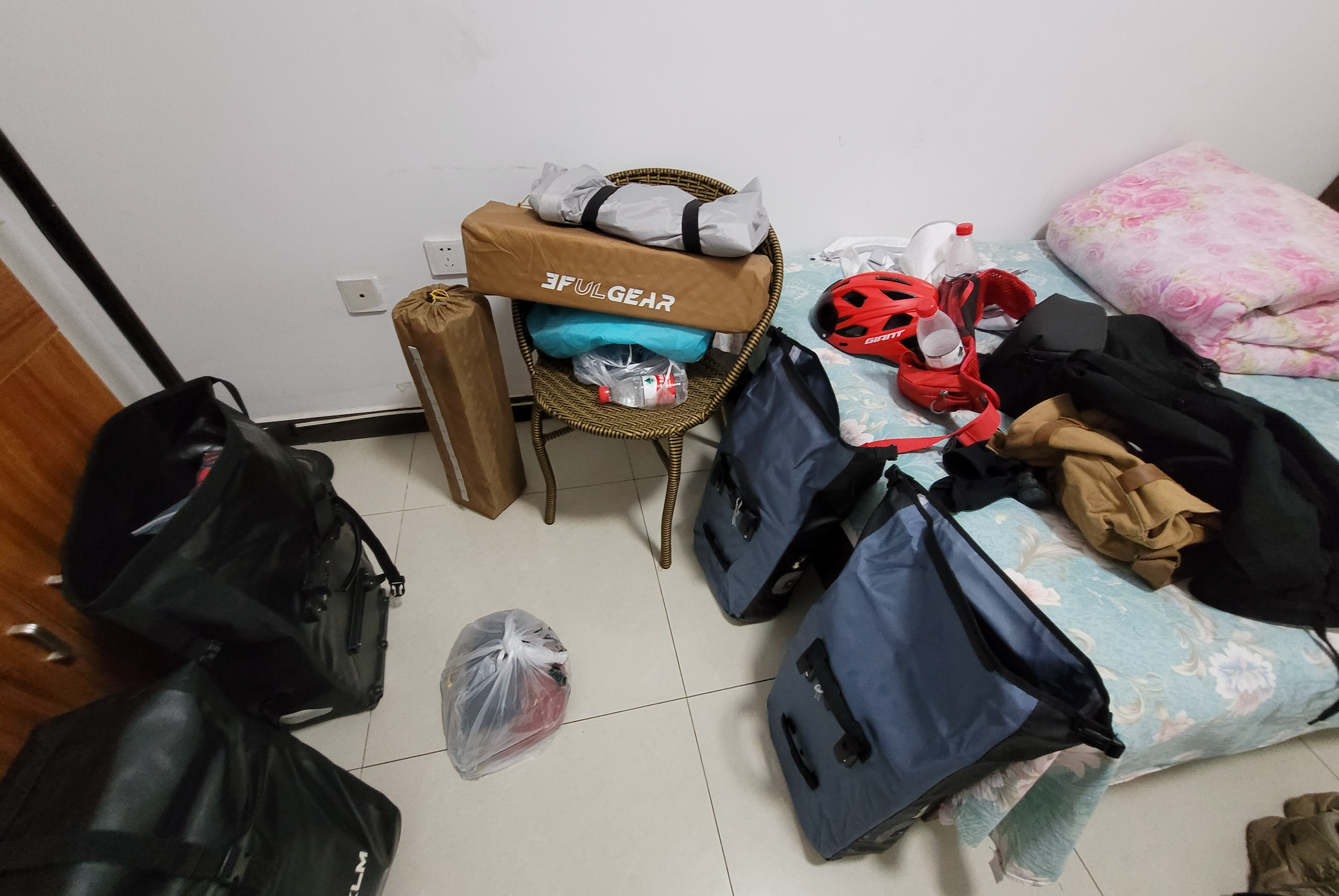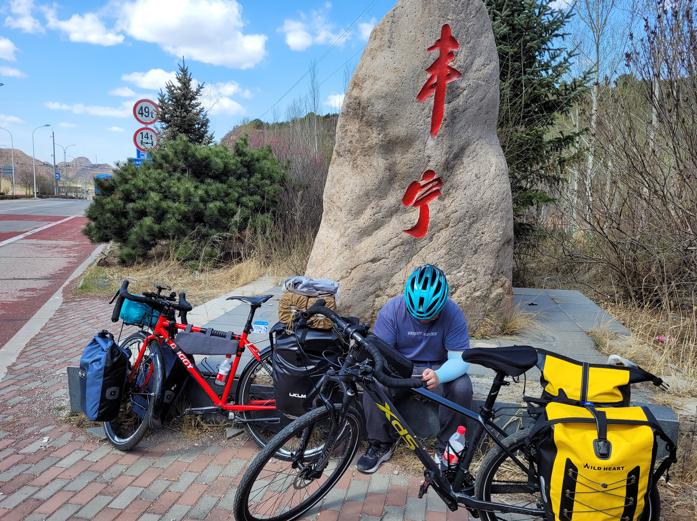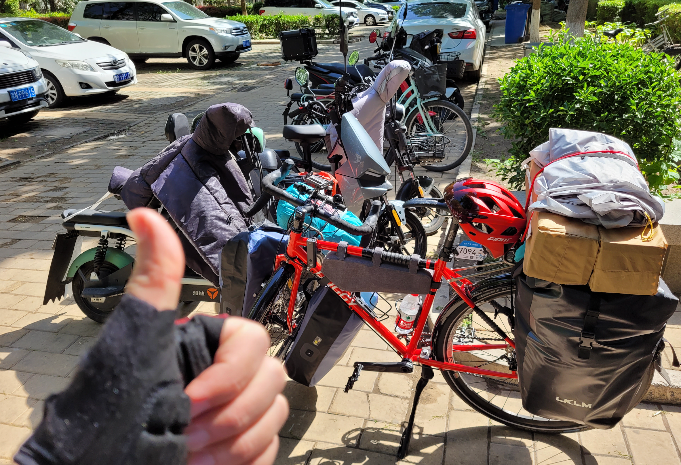 后面行李垒的很高,上车我需要抬腿跨过去,穿着骑行内裤,很不灵活。前轮两边驮包太重了,一骑起来就感觉控制不住,大重量+弯把的缘故,一开始转向特别吃力,差点摔车。