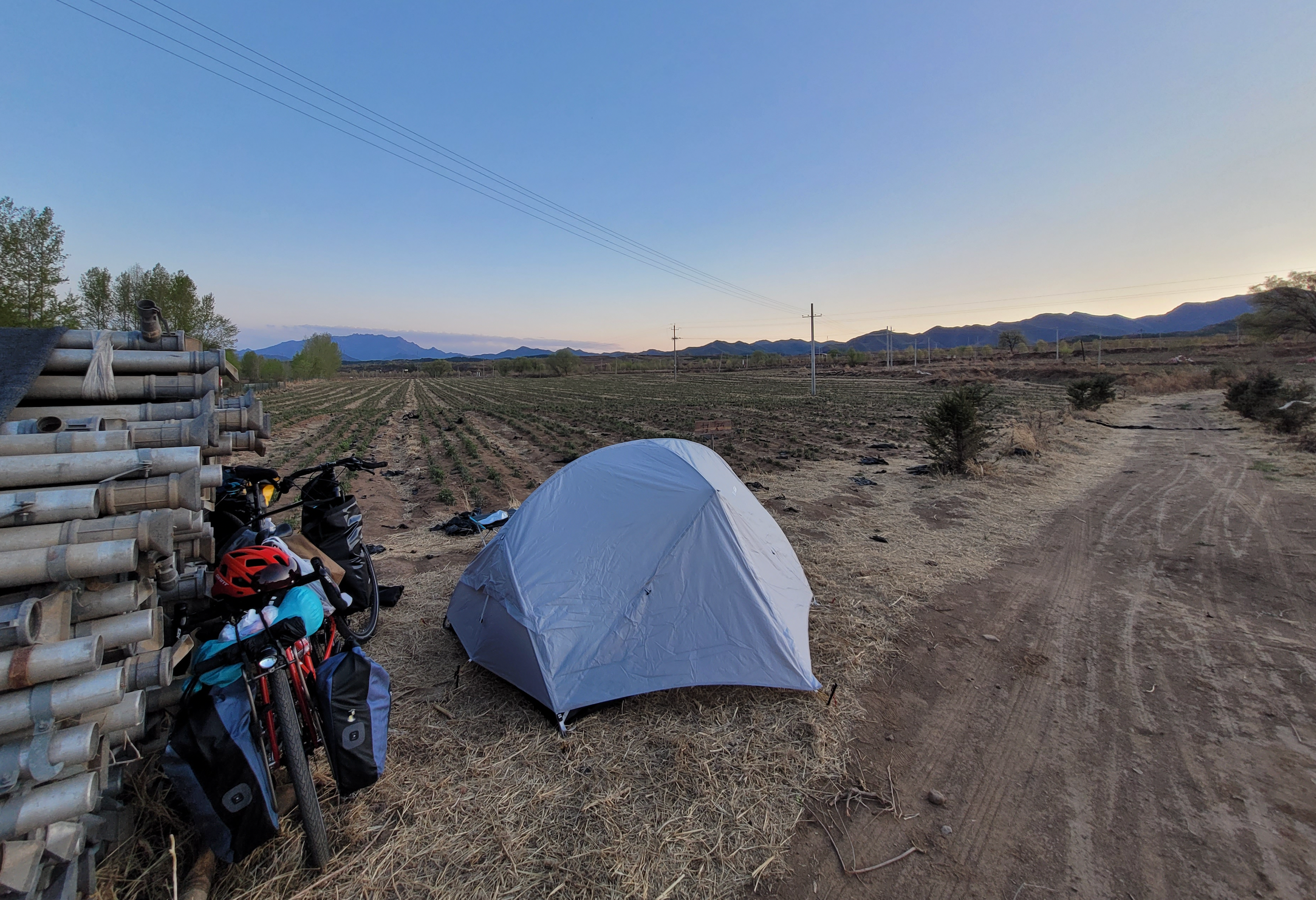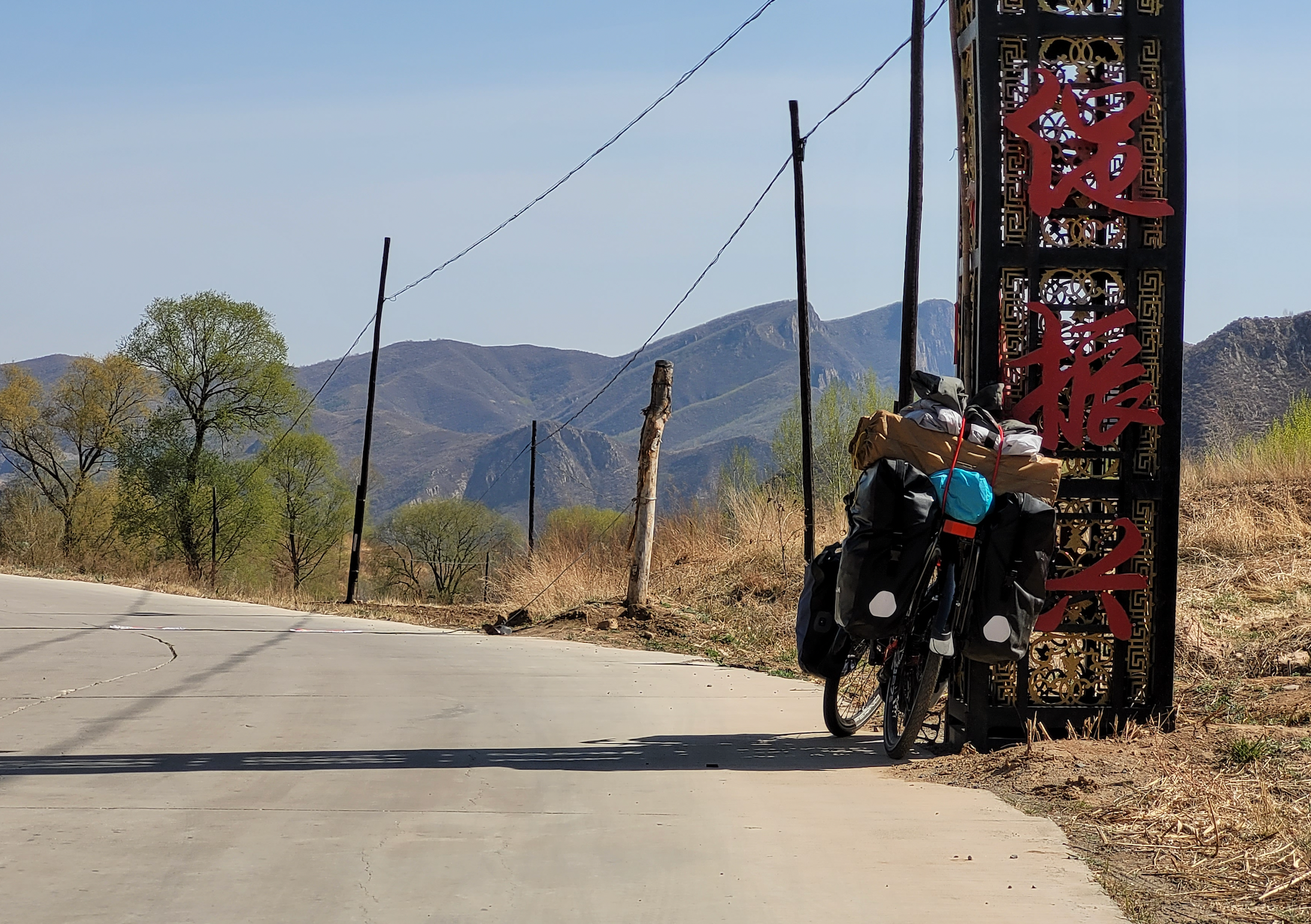 中途又经过一个长上坡,一个短隧道(直接骑着冲过了,推车太折磨)。傍晚经过一个村,叫两间房村。