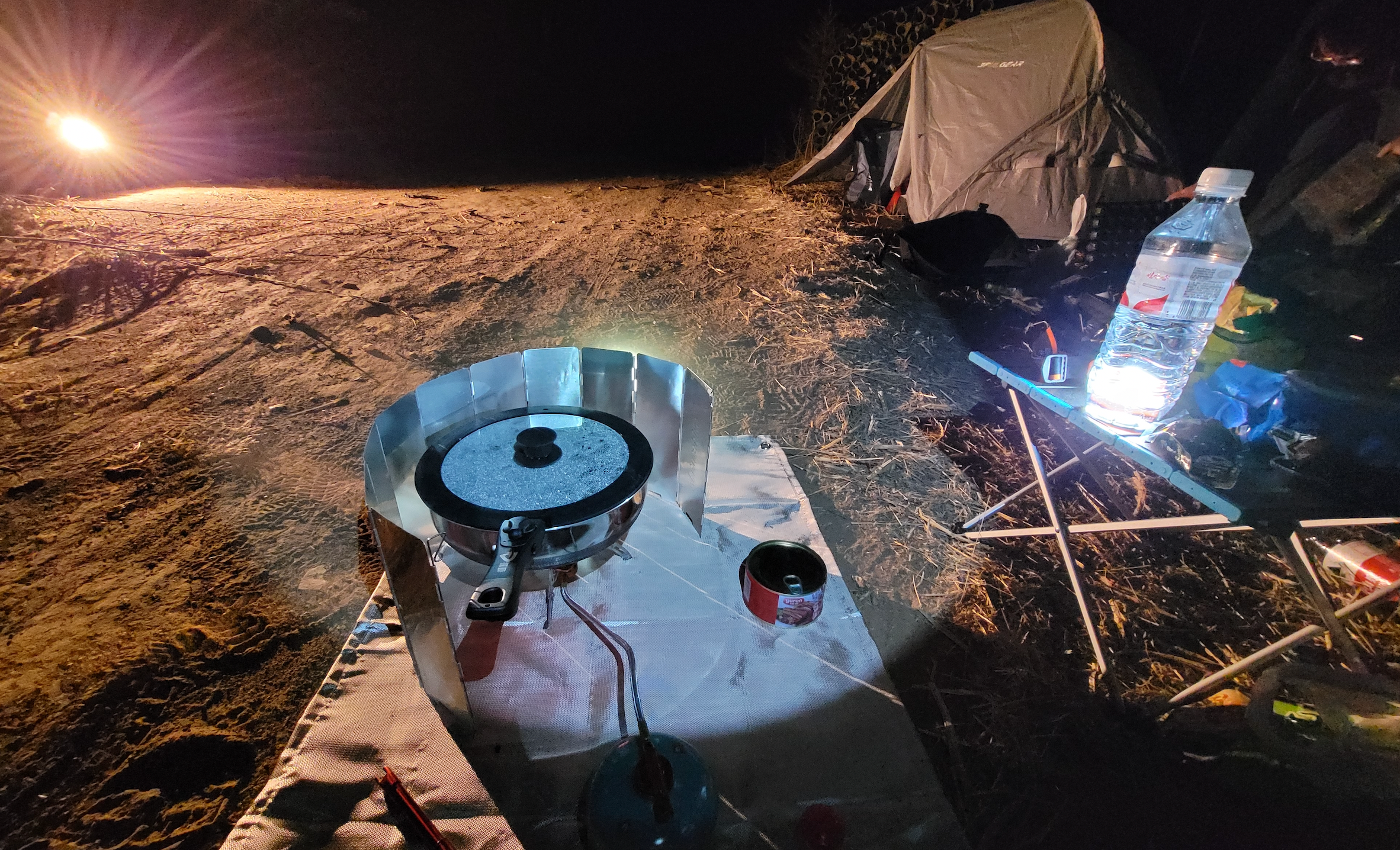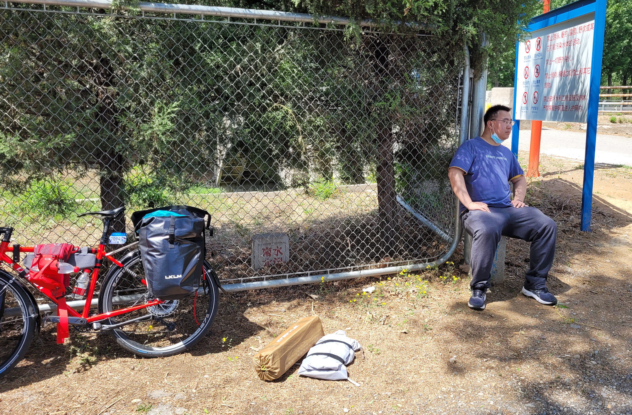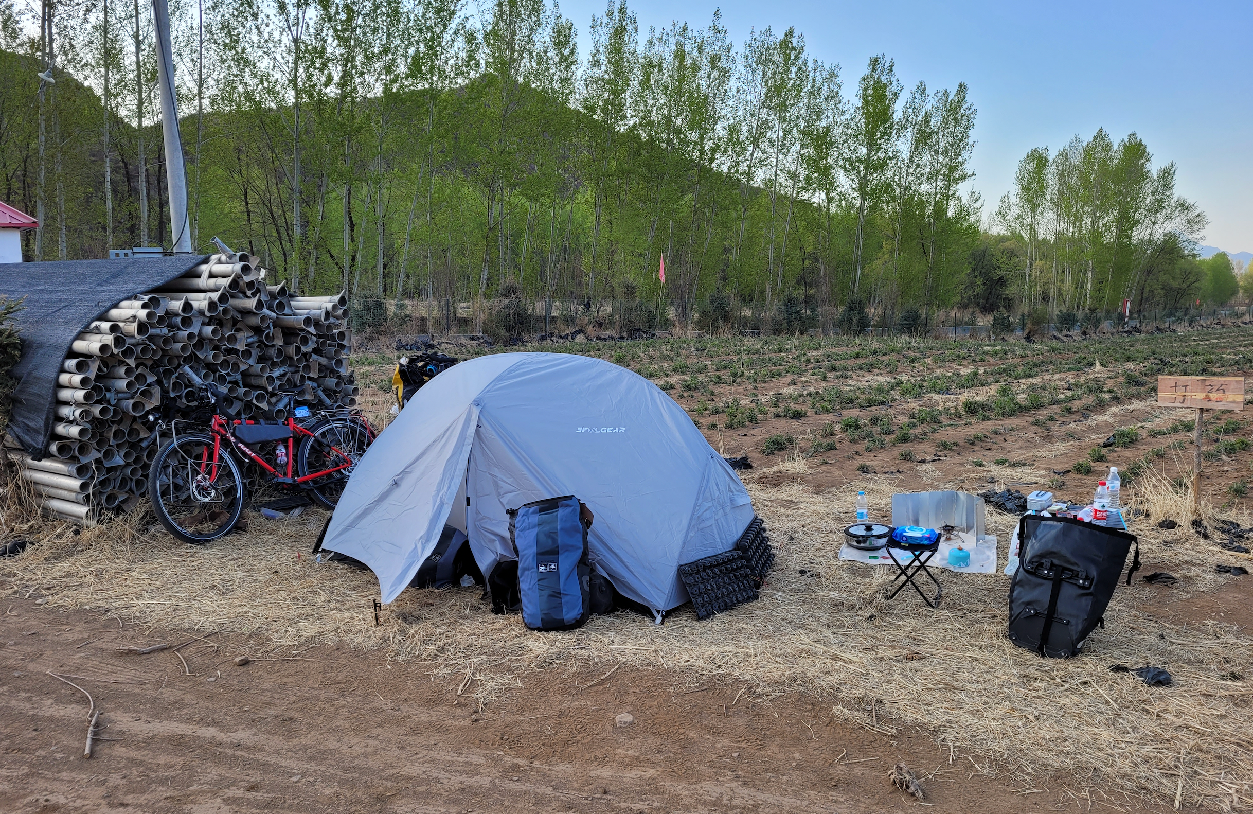 在保安亭旁边的一堆管材下拉翔,以为周围没人,拉完提起裤子发现有个大叔一直在旁边静静地看着不说话。等我拉完他才走过来,问我们昨晚冷不冷。看样子他是护林员,负责森林防火的,在周围巡逻,昨晚应该是看到我们了。大叔还说其实前面有个停用的核酸检测屋子,可以到里面扎营的。这大叔人还怪好的嘞,等我拉完屎才过来搭话哈哈。