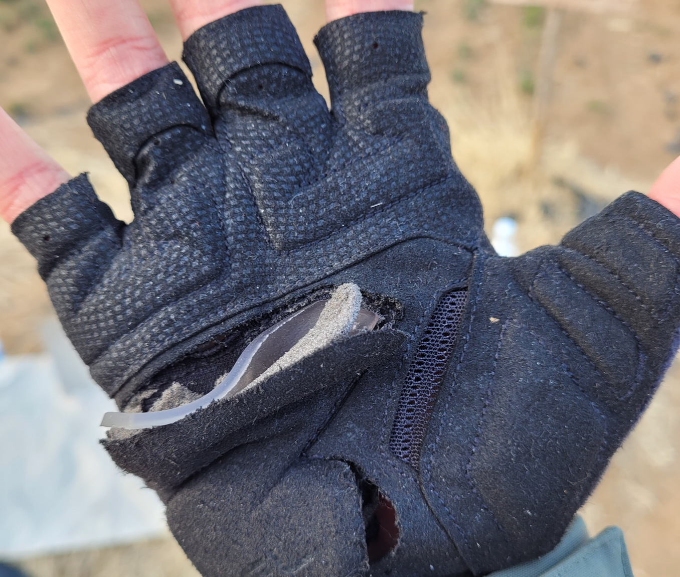 发现手套都破了,奇怪的是只有右手破了,左手一点事都没有。