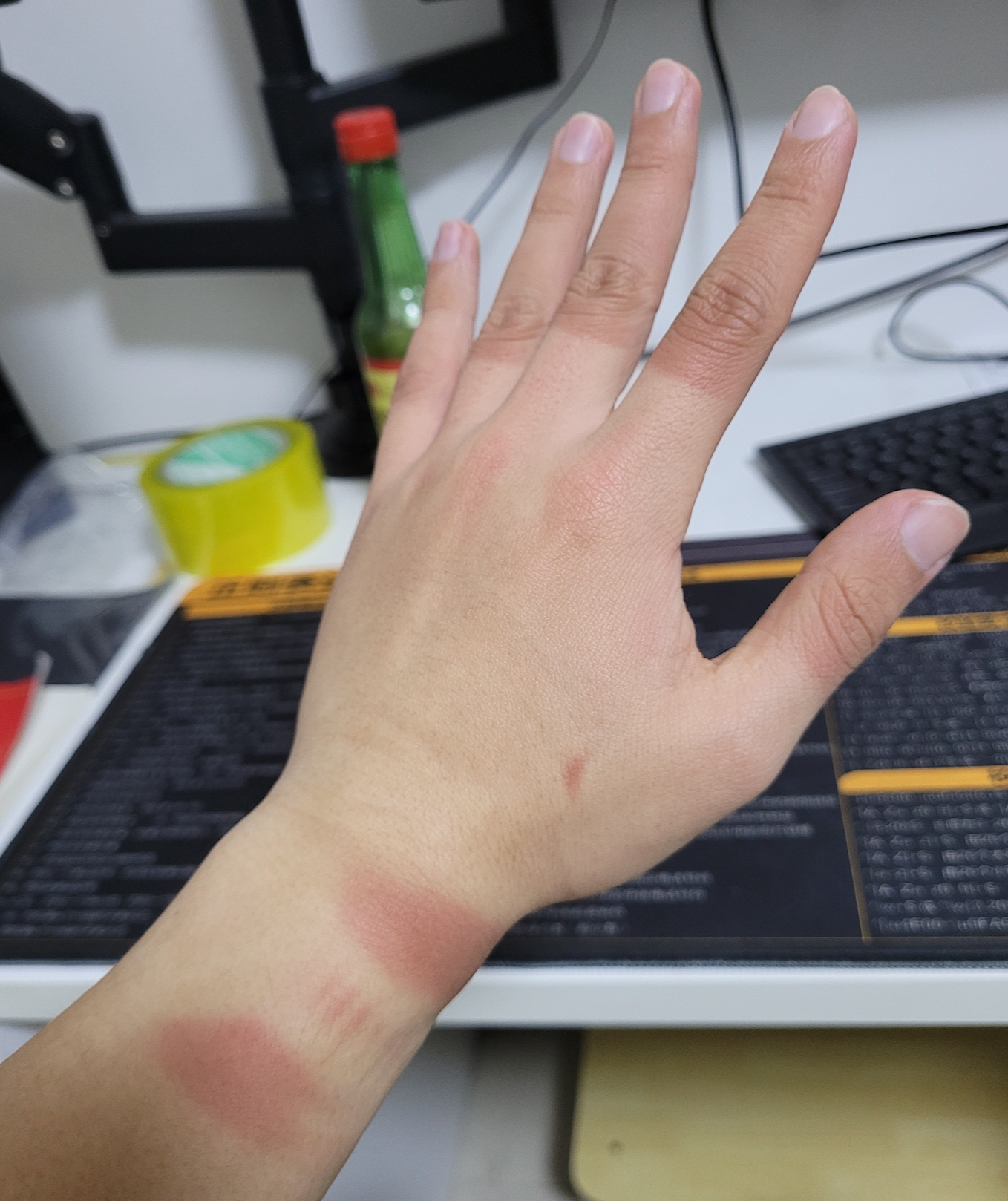 看了看自己的手,手套破了个洞那块地方也精准地晒黑了。。。还有手腕的表带位置也晒出了条纹。