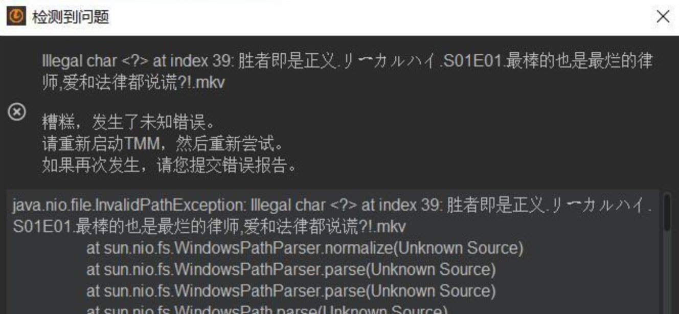 一般是刮日剧的时候会出这个问题,原因是自动重命名的文件名出现非法字符。