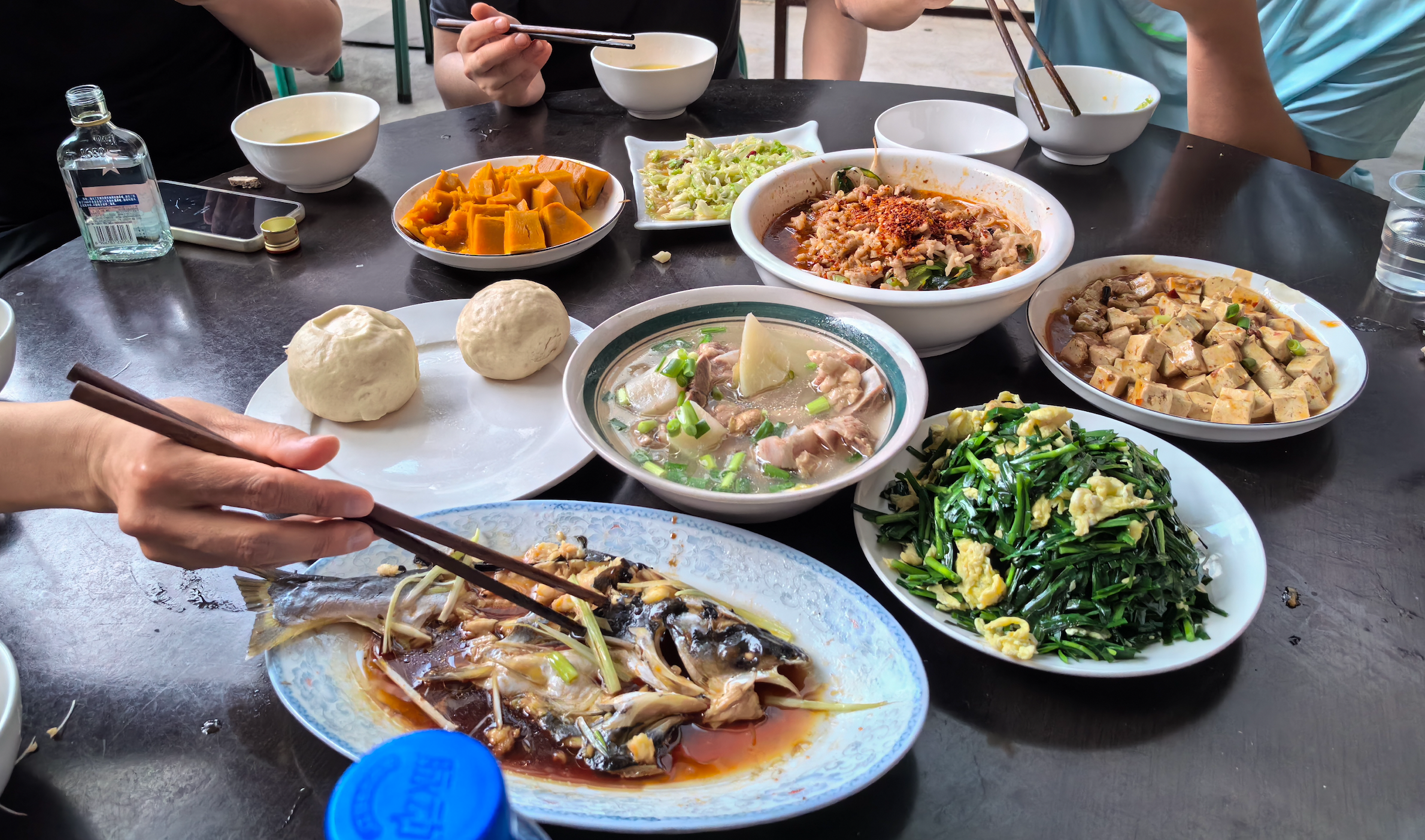 把行李拿下车,放到客栈外面的桌子上,准备吃午餐。午餐是朴实无华的鸡蛋面,虽说是鸡蛋面,其实大部分是素菜。不过待会徒步主要补充的是碳水,鸡不鸡蛋的无所谓。15元一位,面条是无限续的,我担心吃太饱待会背包腰封勒着肚子难受,所以就吃了一碗。